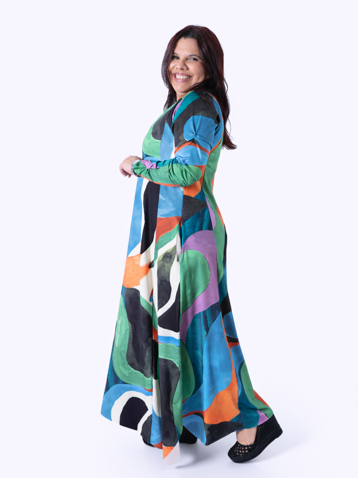Com caimento fluido e corte amplo, cria um efeito elegante e alongador. O grande destaque está nas diferentes formas de amarração, permitindo usar o vestido de várias maneiras e adaptar o look a diferentes ocasiões.